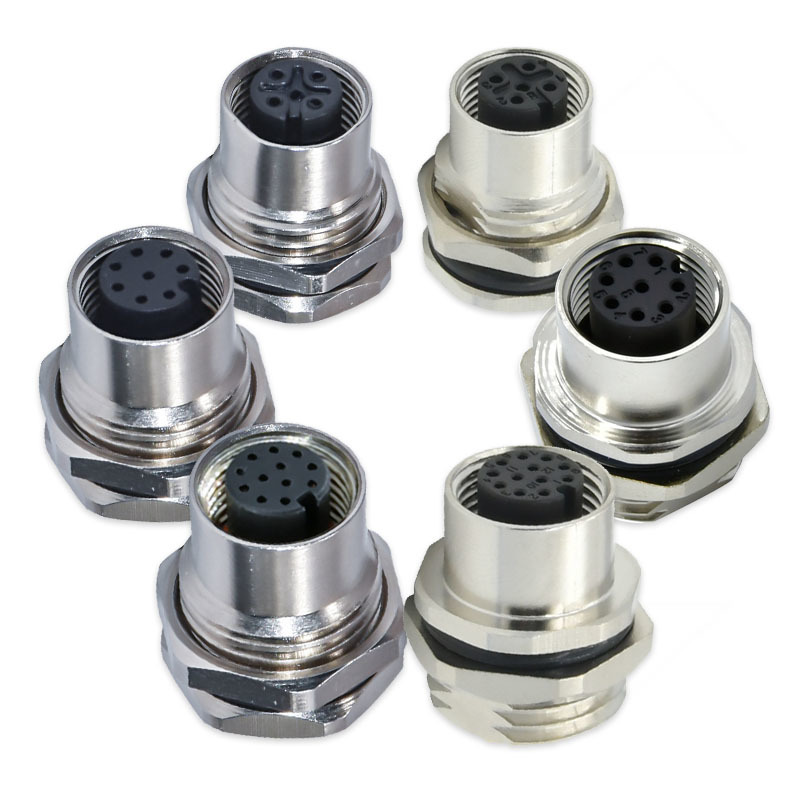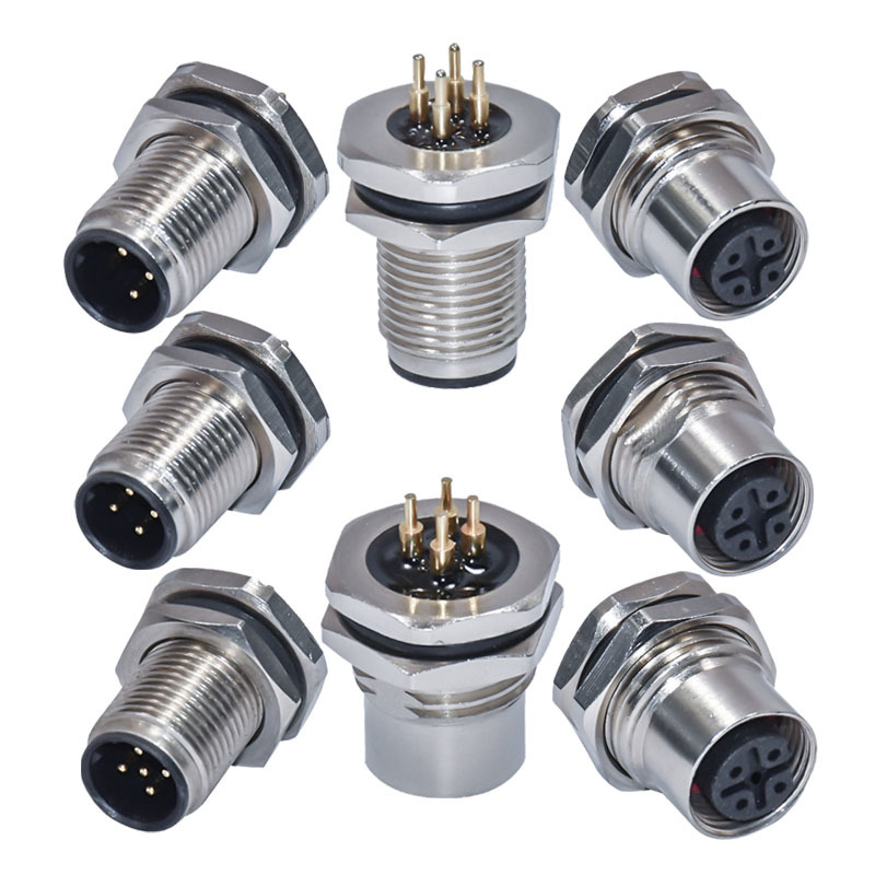 Conector M12 de alta qualidade com configuração de 90 graus, disponível em várias configurações de pinos (3, 4, 5, 8, 12, 17 pinos) para aplicações de sensores de PCB. Adequado para conexões masculinas e femininas em ambientes automotivos e industriais.